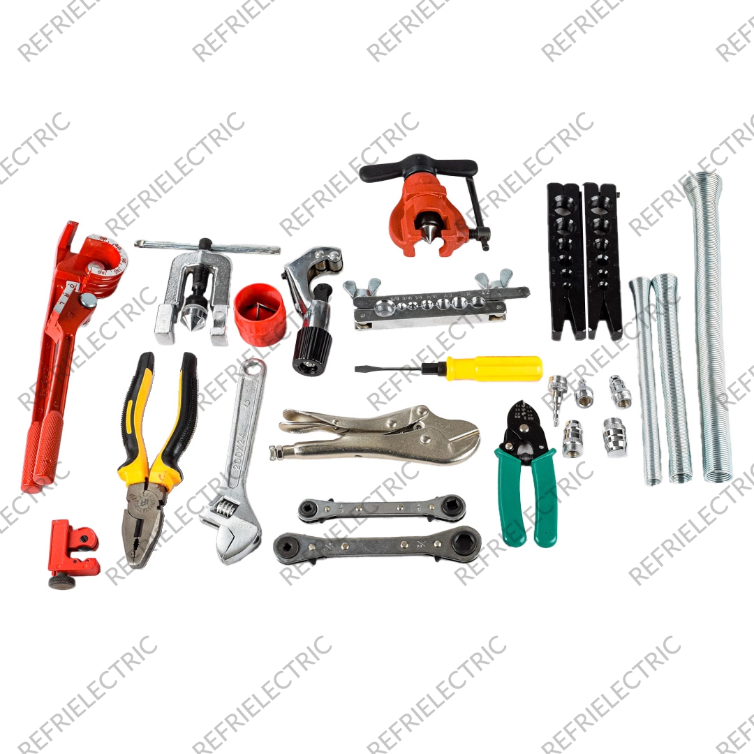 KIT DE HERRAMIENTAS 15 PIEZAS . APLICACIÓN: REFRIGERACI0N, AIRE ACONDICIONADO, ETC . INCLUYE:2 LLAVE RATCHET CON MEDIDAS 3/16″-1/4″-3/8″-5/8″ . ALICATE ELECTRICISTA DE 8″ . ALICATE SELLATUBO . PRENSA PARA HACER EXPANSION RECTA Y CONICA EN TUBO DE COBRE . DOBLADOR 3 EN 1 PARA TUBERIA DE COBRE CON MEDIDAS: 1/4″-3/8″-5/16″ . CORTA TUBO MINI DE 1/8″ A 5/8″ . CORTATUBO CON MANGO DE 1/8″ A 1.1/8″ . ESCARIADOR DE TUBERIA. . 3 DOBLATUBO DE RESORTE . DESTORNILLADOR DE ESTRELLA . ALICATE CORTA CAPILAR . LLAVE DE EXPANSION 8″ .