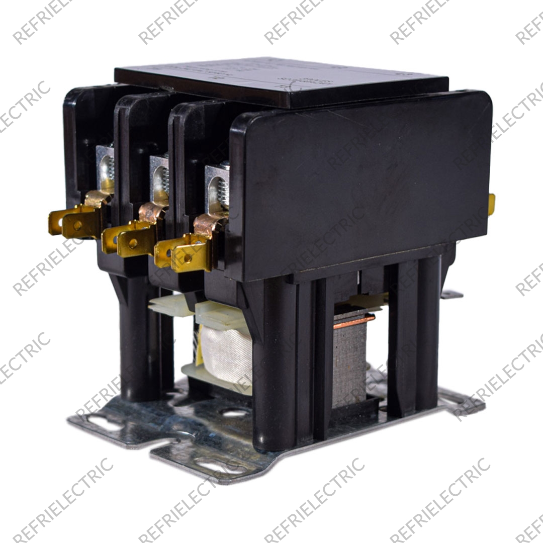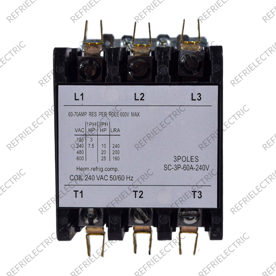 CONTACTOR MULTIPROPOSITO . POLOS:3 . CAPACIDAD DE CORRIENTE: 60AMP . CORRIENTE OPERATIVA NOMINAL(RES):75AMP . VOLTAJE BOBINA:240V . FUNCION: COMPONENTE ELECTROMECANICO QUE TIENE POR OBJETIVO ESTABLECER O INTERRUMPIR EL PASO DE CORRIENTE, YA SEA EN EL CIRCUITO DE PÓTENCIA O EN EL CIRCUITO DE MANDO. TAN PRONTO SE DE TENSION EN LA BOBINA . CARASTERISTICAS: . MUY FACIL DE INSTALAR Y REEMPLAZAR, AHORRA TIEMPO Y ENERGIA . CONTACTOS DE TORNILLOS PESADOS Y TERMINALES MACHO PARA UNA CONEXION RAPIDA, CONVENIENTE PARA SU REEMPLAZO RAPIDO . APLICACION: AMPLIAMENTE UTILIZADO PARA EL CONDENSADOR O COMPRESOR DEL AIRE ACONDICIONADO, PARA CONTROLAR EL MOTOR ENCENDIDO O APAGADO.