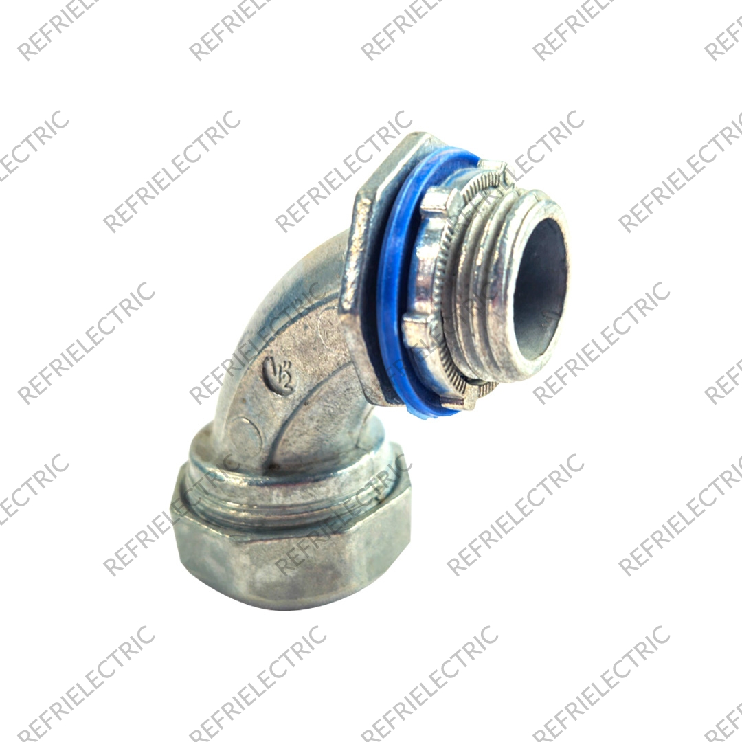CONECTOR LIQUID TIGHT CURVO 90° 1/2″ . CONECTORES CURVOS A 90° MANUFACTURADOS EN ZINC(diecast), EQUIPADOS CON BOQUILLAS PLASTICAS DENOMINADAS GARGANTAS AISLADAS, QUE EVITAN EL DESGASTE DE LOS CONDUCTORES, PROTEGIENDOLOS DE LA FRICCIONES . CARASTERISTICAS: . DISEÑADOS PARA LOGRAR UN PERFECTO ACOPLE EN LA INSTALACION EN CONJINTO CON LA TUBERIA METALICA FLEXIBLE(CORAZA), QUE ASEGURA SUS CARASTERISTICAS DE HERMETICIDAD IP64 Y LA RESISTENCIA MECANICA . POSEEN ROSCA STANDARD UTILIZADA EN LAS INSTALACIONES CON CAJAS, CONDULETAS ETC.