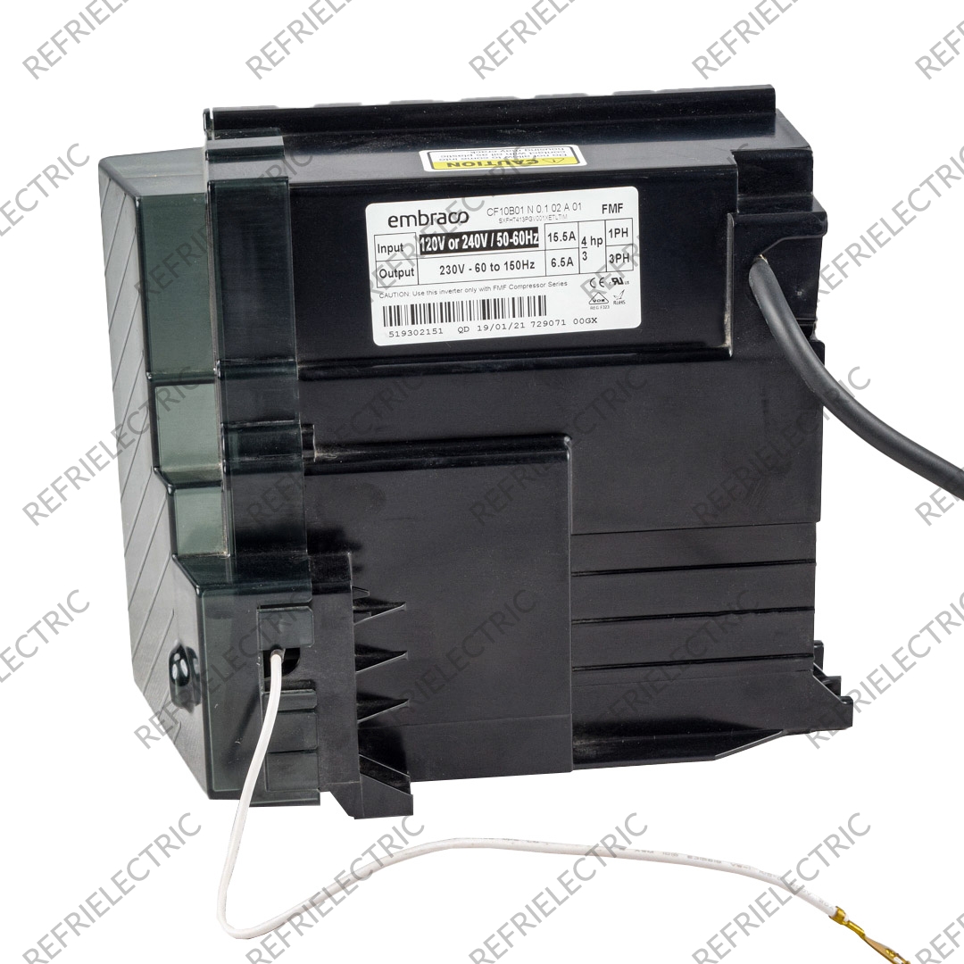 MODULO INVERSOR EMBRACO . MODELO: CF10B01 N 0.1 02 A 01 . CAPACIDAD(HP): 4/3 . VOLTAJE DE ENTRADA: 120V-240V 50/60Hz . CORRIENTE: 15.5 Amp . FASES: 1 . VOLTAJE DE SALIDA: 230V – 60 a 150Hz . CORRIENTE: 6.5 Amp . FASES: 3.
